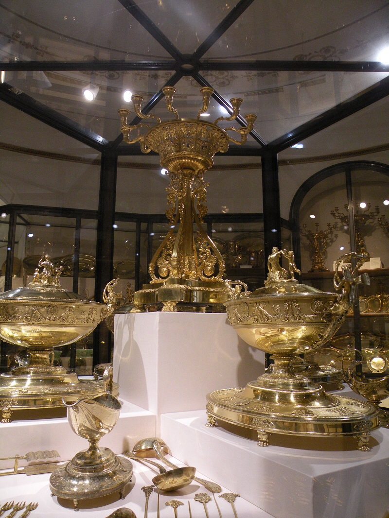 Справеливости ради надо заметить, что поселившийся после из изгнания в Баварии Евгений Богарне, получил за сервиз от Габсбургов солидную денежную компенсацию. А в 1816 году император Австрии Франц Второй в четвертый раз втупал в брак. Нет, он вовсе не был Синей Бородой, просто супруги ему попадались весьма чахлые: первая, Елизавета Вюртембургская, умерла во время родов; вторая супруга, Мария-Терезия Сицилийская произвела на свет шестерых детей и скончалась в возрасте 34 лет, третья по счету, Мария Людовика, детей на свет не произвела и умерла от чахотки через 6 лет после свадьбы. И вот, в 1816 году, происходило четвертое бракосочетание императора. Избранницей стала Шарлотта Августа Баварская. Император Франц Первый, победитель Наполеона, должен был во время этого торжества презентовать себя как можно величественнее, что в некоторых аспектах оказалось весьма затруднительным: во время Наполеоновских войн вся золотая и серебряная посуда Габсбургского двора пошла на чеканку монет, парадный стол накрывать было нечем. И тут сервиз Гранд Вермейл оказался как нельзя более кстати: он стал главным украшением императорского свадебного стола. Благодаря этому сияющему золотом красавцу перед людьми стыдно не было.