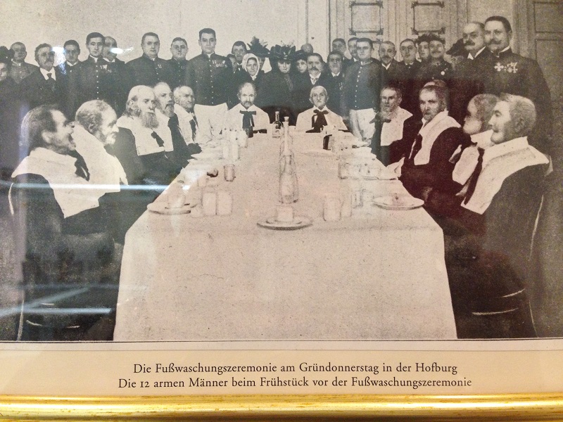 В Зеленый четверг, т.е. в четверг перед Пасхой (в православной традиции "чистый четверг"), в императорской зимней резиденции Хофбург традиционно проходила церемония омовения ног двенадцати старикам и двенадцати старухам. Традиция это давняя, библейская ( как Христос мыл ноги ученикам своим...), в католицизме широко распространенная. В Зеленый четверг Папа римский моет ноги 12 старикам, омовение происходит также во многих католических церквях и монастырях. Для этой придворной церемонии в отбирали 12 стариков (если императрица была на месте, то и 12 старух) по строгим критериям: они должны были быть католиками, не иметь заразных заболеваний и быть, как сейчас принято говорить, "конкретно" стариками, т.е. максимально преклонного возраста. Вот список 12 стариков для омовения ног в 1906 году. Никого моложе 89 лет мы здесь не обнаружим.