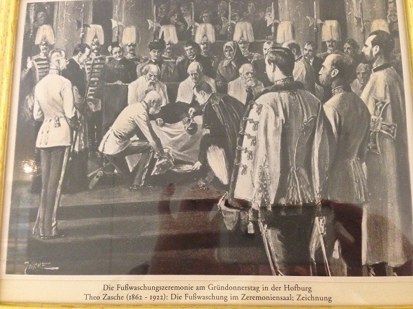 В зал в сопровождении личной охраны входили император и эрцгерцоги ( в российской традиции "эрцгерцог" соответствует "великому князю") и убирали нетронутую еду со стола, т.е. торжественно передавали тарелки и блюда в руки лейб-гвардейцев, а те в свою очередь, торжественно уносили все прочь. Тем временем стариков переводили в один из парадных залов, где уже ожидала почтенная публика. Стариков рассаживали на заранее приготовленные места и дальше происходило следующее: старший по званию священник лил воду на ноги старику вот из такого кувшина,