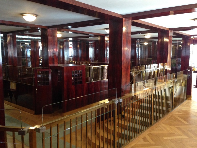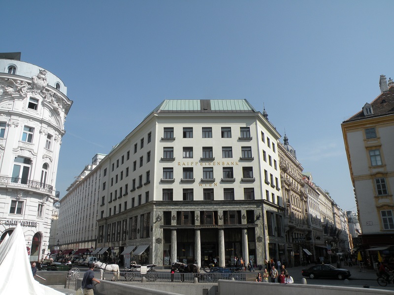 Знаменитый архитектор (Адольфу Лоосу мы отчасти должны быть благодарны за то, что живем в зонально спланированных квартирах, а не в анфиладах комнат) построил дом в характерной для него лаконичной строгой манере, и фасад его лишён каких-либо украшений. Когда к 1911 году стало ясно, какого рода строение возводится на Михаэллерплац, возмущению городских властей не было конца. По их требованию стройка дважды прерывалась, но тем не менее строительство было доведено до конца, и появление дома Адольфа Лооса на площади Михаэллерплац сопровождалось грандиозным скандалом. Рассказывают, что сам император Франц Иосиф раз и навсегда задёрнул шторы своего кабинета в Крыле Святого Михаила Хофбурга (напротив), чтобы никогда не видеть это безобразие. Что же вызвало такое возмущение? Если мы посмотрим на рядом стоящие дома, то мы с вами поймём, что абсолютно плоский фасад с ничем не обрамлёнными окнами был немыслим для Вены начала ХХ века. Обратите внимание, все окна соседних домов в большей или меньшей степени обрамлены. Император наградил этот дом прозвищем «Дом без бровей». Позднее под окна дома были повешены цветочные ящики, в которых летом по сей день высаживают ампельную герань, а ироничные жители города стали звать этот дом «домом без бровей, но с мешками под глазами». Сейчас в этом доме располагается «Райфайзенбанк», и все интерьеры за исключением первого этажа закрыты для широкой публики. А посмотреть есть на что! Все интерьеры были Райфайзенбанком отреставрированы и приведены в первозданное состояние. Мне посчастливилось увмдеть эту красоту благодаря очаровательной Веронике Пфнайсцль, финансовому советнику банка.