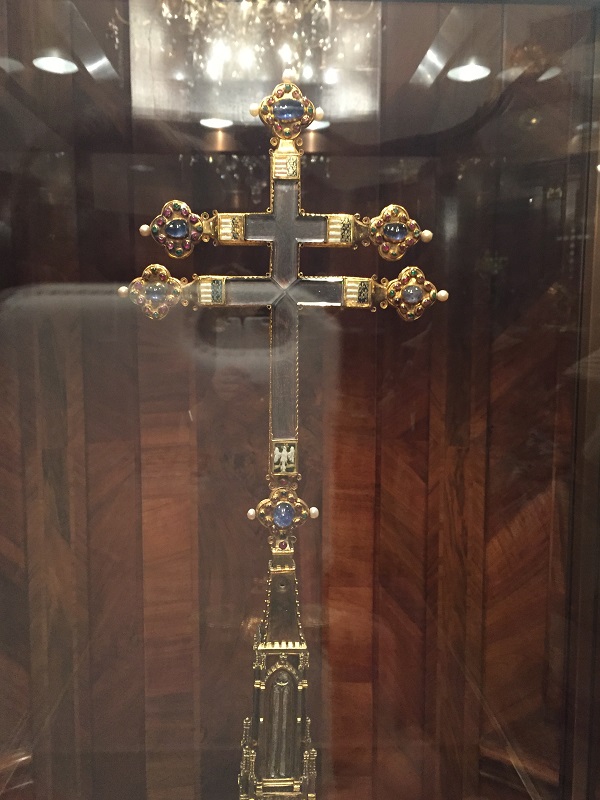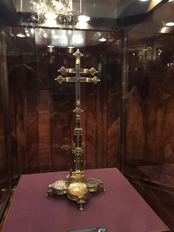 В 1865 году бесценный крест был передан на реставрацию в мастерскую Саломона Вайнингера. Тот быстро изготовил копию шедевра и вернул ее в императорскую сокровищницу как бы отреставрировав. А оригинал ловкий антиквар распилил на две части и выгодно продал. В 1927 году Венгрия и Австрия, избавившись задолго до того от императора, делили императорскую сокровищницу. По тогдашнему соглашению, крест Людовика Великого (то есть подделка Саломона Вайнингера) поехал в Будапешт, где красуется по сей день в Национальном музее. А вот оригинал обнаружили случайно. Сначала была выставлена половина подлинного креста-реликвария в одном из музеев Лондона. Тогда-то и вскрылась вся эта история с жуликоватым венским антикваром. А потом у частного коллекционера в Дании австрийцы обнаружили вторую часть средневекового шедевра и удачно ее приобрели. Так что теперь подлинный крест-реликварий украшает императорскую Сокровищницу в Вене.