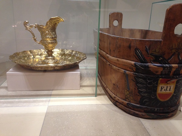 В зал в сопровождении личной охраны входили император и эрцгерцоги ( в российской традиции "эрцгерцог" соответствует "великому князю") и убирали нетронутую еду со стола, т.е. торжественно передавали тарелки и блюда в руки лейб-гвардейцев, а те в свою очередь, торжественно уносили все прочь. Тем временем стариков переводили в один из парадных залов, где уже ожидала почтенная публика. Стариков рассаживали на заранее приготовленные места и дальше происходило следующее: старший по званию священник лил воду на ноги старику вот из такого кувшина,