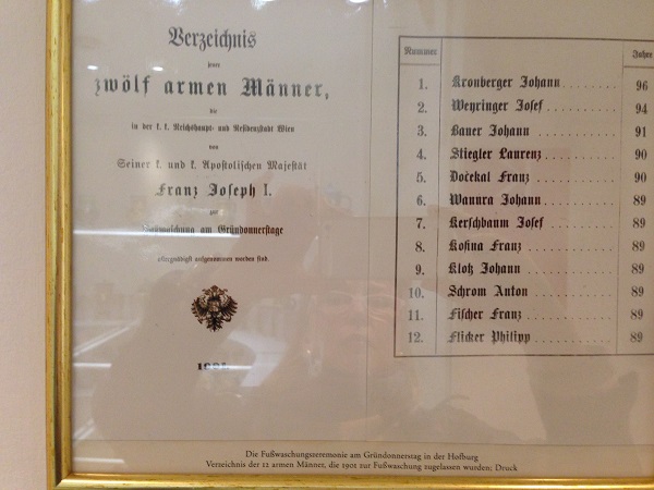 В Зеленый четверг, т.е. в четверг перед Пасхой (в православной традиции "чистый четверг"), в императорской зимней резиденции Хофбург традиционно проходила церемония омовения ног двенадцати старикам и двенадцати старухам. Традиция это давняя, библейская ( как Христос мыл ноги ученикам своим...), в католицизме широко распространенная. В Зеленый четверг Папа римский моет ноги 12 старикам, омовение происходит также во многих католических церквях и монастырях. Для этой придворной церемонии в отбирали 12 стариков (если императрица была на месте, то и 12 старух) по строгим критериям: они должны были быть католиками, не иметь заразных заболеваний и быть, как сейчас принято говорить, "конкретно" стариками, т.е. максимально преклонного возраста. Вот список 12 стариков для омовения ног в 1906 году. Никого моложе 89 лет мы здесь не обнаружим.