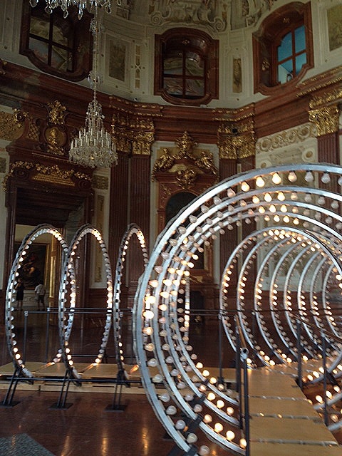 В Бельведере в Мраморном зале выставлена композиция австрийского художника Карстена Хёллера "Жизнь". В том смысле, что жизнь - светящаяся спираль, внутри которой сделана дорожка. А лампочки на спирали горят с разной степенью интенсивности и чуть смещены, что рождает эффект движения - будто бы спираль медленно, по змеиному скользит по часовой стрелке. Занятно. Вот только я все думаю, а это правильно такую жизнь устанавливать в интерьере парадного зала 18 века? А почему бы и нет? Ну ведь искусство должно развиваться и заявлять о себе? Эпатировать иногда публику? Не знаю. А может и здорово.
