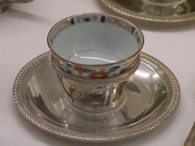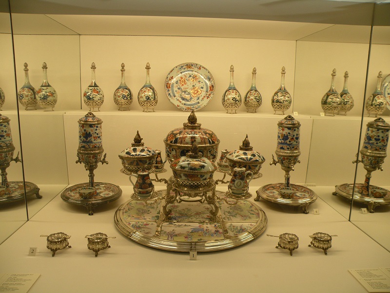 В 16 веке в Японии в районе Арита была обнаружена первоклассная глина, пригодная для производства высококачественного фарфора. Было организовано производство, и на свет появился фарфор, впоследствии названный "имари". От китайского фарфора его отличала необычная цветовая гамма - сочетание синего и оранжевого цветов. Фарфор этот начал пользоваться огромной популярностью у европейцев. Как было принято в то время, фарфор сначала обрамляли в серебро, чтобы сделать его пригодным для европейского образа жизни. Вот такой сервиз для путешествий был создан на основе фарфора имари для императрицы Марии-Терезии.