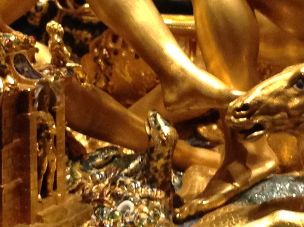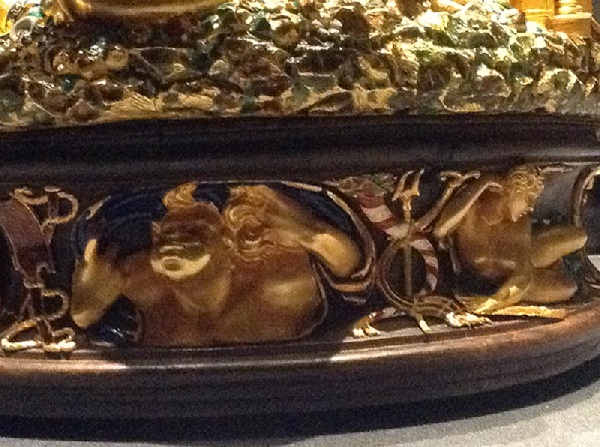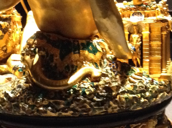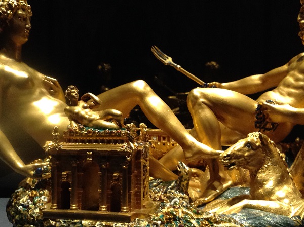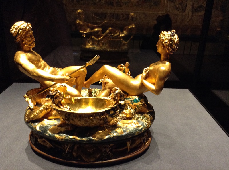 Как это ни странно, эта сложная многофигурная композиция является просто солонкой. Зато можно быть уверенными, это самая ценная солонка на земле. Создал этот шедевр скульптор 15 века Бенвенуто Челлини по заказу французского короля Франциска Первого. Кстати, это единственная работа мастера в жанре мелкой пластики, дожившая до наших дней. Когда король Франции своей царственной рукой двигал солонку по столу ( а она ездит на шести шарах из слоновой кости), все присутствующие, умеющие читать символы, видели, что ему подвластно все на земле. Потому что на солонке обозначены все четыре земных элемента: напротив друг друга сидят Посейдон (вода) и Церера (земля). За воздух отвечают четыре дующих физиономии на цоколе солонки.