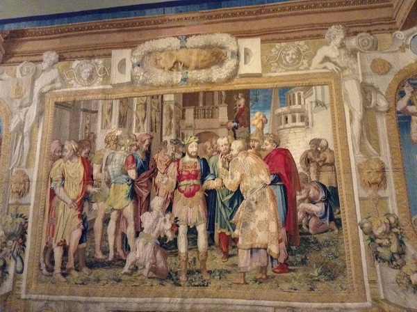 Вот она же на гобелене, висящем рядом, прямо над изображением французского короля.