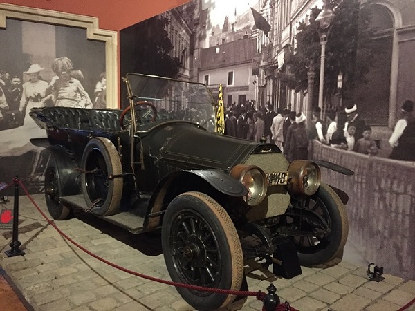 Эрцгерцог Франц-Фердианд был невероятно удачливым человеком. Сначала он стал невероятно богат. Семейство Габсбургов было обширно и многочисленно, среди членов этого семейства были более богатые и менее, с большим или меньшим политическим влиянием. Франц-Фердинанд , по рождению, не должен был стать ни богатым, ни влиятельным. Однако судьба распорядилась иначе. Случилось так, что в возрасте 12 лет он унаследовал состояние герцогов Д Эсте (его мать приходилась им родней). С этого момента он стал не только одним из богатейших представителей Габсбургского семейства, но и всей Австро-Венгерской империи. В молодости заболел туберкулезом – и благополучно от него излечился. А потом стал наследником престола – тоже результат стечения обстоятельств: сначала покончил собой сын правящего императора Франца-Иосифа, кронпринц Рудольф, в результате чего отец Франца-Фердинанда, Карл Людвиг, стал наследником престола. Но через семь лет пожилой кронпринц выпил воды из реки Иордан, заболел брюшным тифом и умер. Франц-Фердинанд сделался наследником престола. А потом он влюбился и захотел жениться. Невеста никак не годилась будущему императору Австро-Венгерской Империи. Избранницей кронпринца стала неродовитая, небогатая и немолодая чешская графиня Хотек. Император Франц-Иосиф было заупирался, разрешения давать не хотел, но потом махнул рукой. Францу-Фердинанду пришлось только согласиться с тем, что дети от этого морганатического брака не буду наследовать престол. В 1914 году ему должен был исполниться 51 год. Он был здоров, счастлив, богат и с перспективой стать императором. Визит в Сараево – вполне рабочая поездка, смотр войск, что по статусу входило в обязанности кронпринца. Счастливец отправился на окраину империи с обожаемой женой. Ну, а дальше все известно. Оказывается, покушение было уже подготовлено. Сначала в сторону кортежа эрцгерцога была брошена бомба. Эрцгерцог ехал со своей женой вот в этой машине марки Грэф унд Штифт, 1910 год, 4-х цилиндровый двигатель, номер 28-32ПС. От брошенной бомбы машина с кронпринцем не пострадала. Но пострадал шофер и пассажиры третьей машины. Франц Фердинанд произнес торжественную речь в Ратуше, после чего отправился в госпиталь навестить пострадавших в результате покушения. Шофер сбился с дороги, начал разворачивать машину, и в этот момент, по странному совпадению, там оказался член террористической группы Гаврила Принцып. Он выстрелил в живот графине Хотек. Затем выстрелил повернувшемуся к жене Францу Фердинанду в шею. Кронпринца и супругу спешно доставили в резиденцию губернатора. Графиня скончалась через несколько секунд, наследник трона последовал за ней через 10 минут. После покушения автомобиль некоторое время хранился в Сараево, а затем владелец автомобиля граф Франц Харрах передал его императору Францу Иосифу. Тот, в свою очередь, передал механического свидетеля трагедии Музею военной истории.