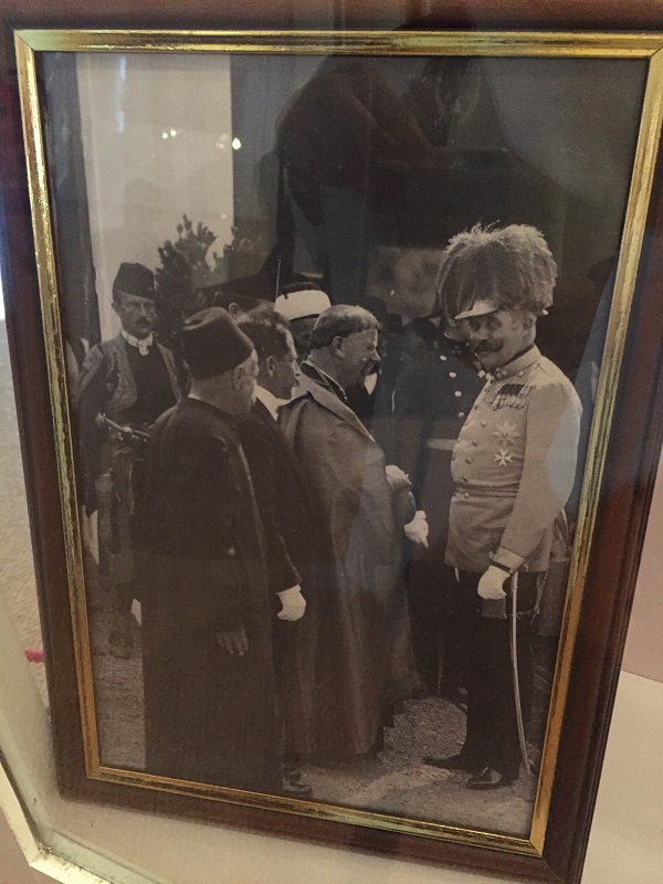 Сразу после выстрелов Гаврилы Принцыпа кронпринца Франца Фердинанда и его супругу спешно доставили в резиденцию губернатора. Графиня скончалась через несколько секунд, наследник трона последовал за ней через 10 минут. Свои последние минуты Франц Фердинанд провел на этой кушетке. В сознание он не пришел. На мундире сохранились подтеки крови и маленькая, совсем незаметная дырочка от пули. Свита эрцгерцога быстро сообразила, что присутствует при историческом событии. Для увековечения этого момента, присутствовавшие в доме губернатора Поциорека срезали перья на головном уборе умирающего. Если присмотреться, то видна лысина среди роскошных перьев.